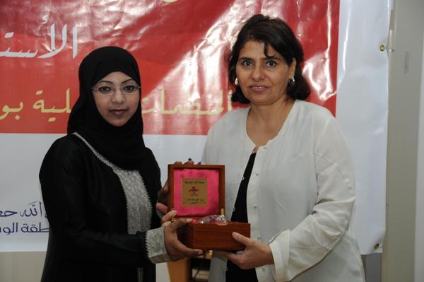 بعدها تقدمت الوكيل المساعد للرعاية الاجتماعية الأستاذة بدرية يوسف الجيب نيابة عن راعية الحفل بتوزيع الدروع التذكارية والشهادات على المشاركين.