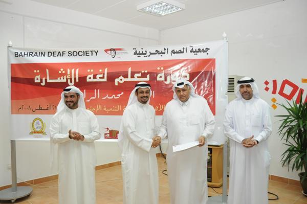 تحت رعاية سعادة الدكتورة فاطمة بنت محمد البلوشي وزيرة التنمية الاجتماعية، اختتمت جمعية الصّم البحرينية دورة ' تعليم لغة الاشارة '، حيث أقامت احتفالاً بالمناسبة مساء الخميس 21 أغسطس 2008م بمركز دعم المنظمات الاهلية التابع لوزارة التنمية الاجتماعية بمنطقة توبلي. هذا وقد حضر الحفل الوكيل المساعد للرعاية الاجتماعية الأستاذة بدرية يوسف الجيب بالنيابة عن راعية الحفل والأستاذ عبدالررزاق حطّاب عضو المجلس البلدي للمحافظة الوسطى وجريدة الايام ومخبز المرزوق، الدّاعمين للدورة.